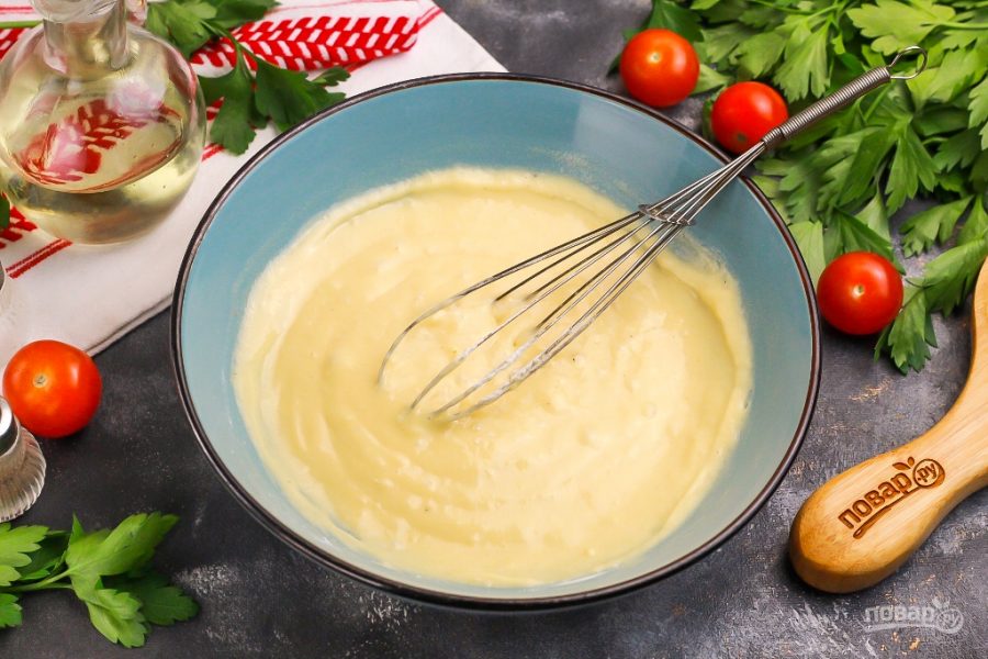 Приготовьте кляр: вбейте куриное яйцо в глубокую миску или пиалу, выложите сметану и влейте воду. Всыпьте соль и молотый черный перец и все тщательно взбейте. По желанию можете добавить и другие специи, пряности.