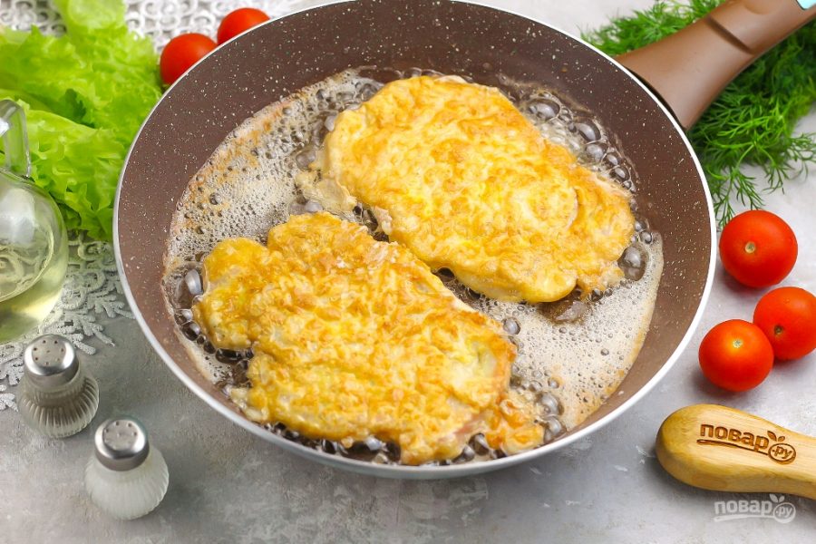 Обжаривайте отбивные 1-2 минуты на сильном нагреве и убавьте затем его до умеренного, так как кляр очень быстро может подгореть, а мясо внутри не прожарится.
