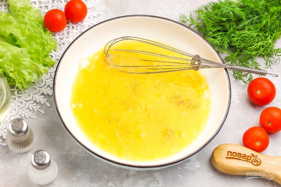 Куриные яйца вбейте в глубокую емкость: миску или салатник и взбейте с помощью венчика или вилки с солью и молотым черным перцем. Отбитое мясо солить и перчить не нужно, специи добавляются в кляр. По желанию можете добавить и другие специи, пряности.