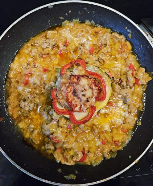 4. Добавляю в чашу измельченные помидор и перец, вливаю половину стакана воды и выставляю программу «Тушение», время — 50 минут, готовлю под закрытой крышкой.