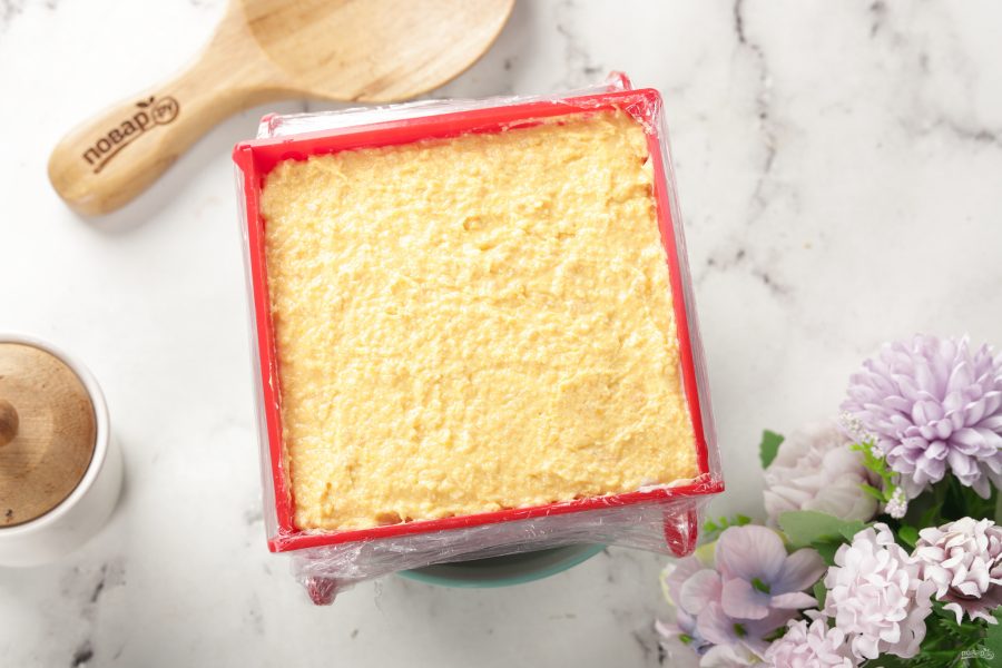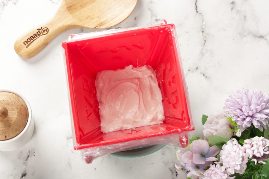 Начинаем укладывать творожную массу слоями, чередуя их по цвету, если вы делаете однотонную, просто выкладываете всю массу в формочку сразу.