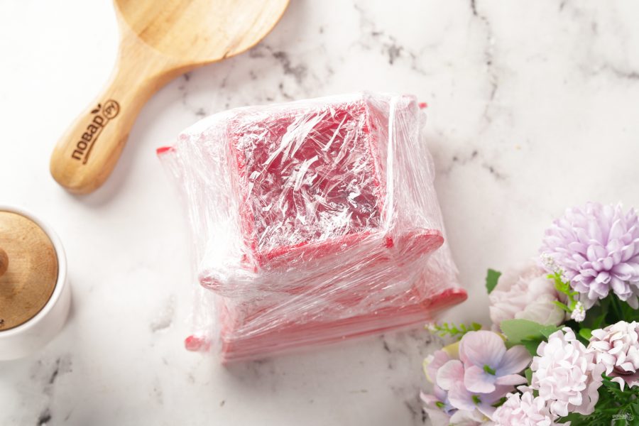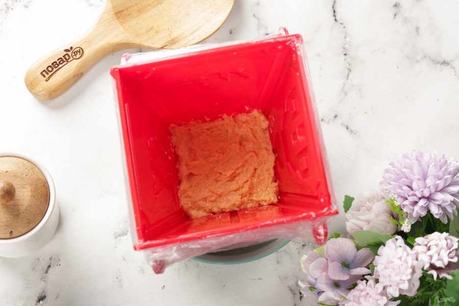 Верх разровняйте ложкой. Накройте краями марли и поставьте под пресс (подойдёт обычная литровая банка с водой). Уберите на ночь в холодильник, периодически сливая выделившуюся жидкость. Если будете делать как я, с пищевой плёнкой, то убираем пасху в морозилку. Я делала вечером, поэтому поставила на всю ночь, но не забывайте, что перед подачей творожную пасху нужно будет ещё разморозить в холодильнике в течение примерно 8 часов. Здесь важна именно медленная разморозка, при быстрой пасха может потечь и потерять форму.