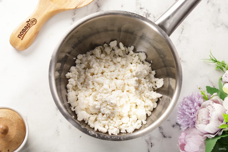 Творог переложите в глубокую ёмкость.