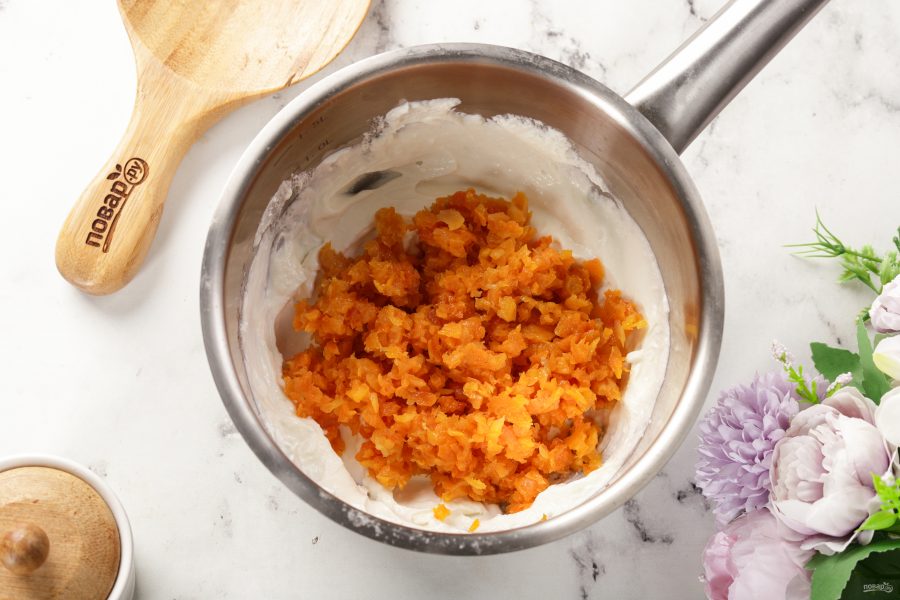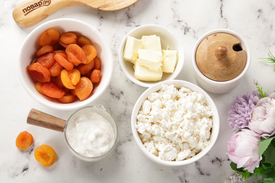 Добавьте курагу к половине творожной массы.