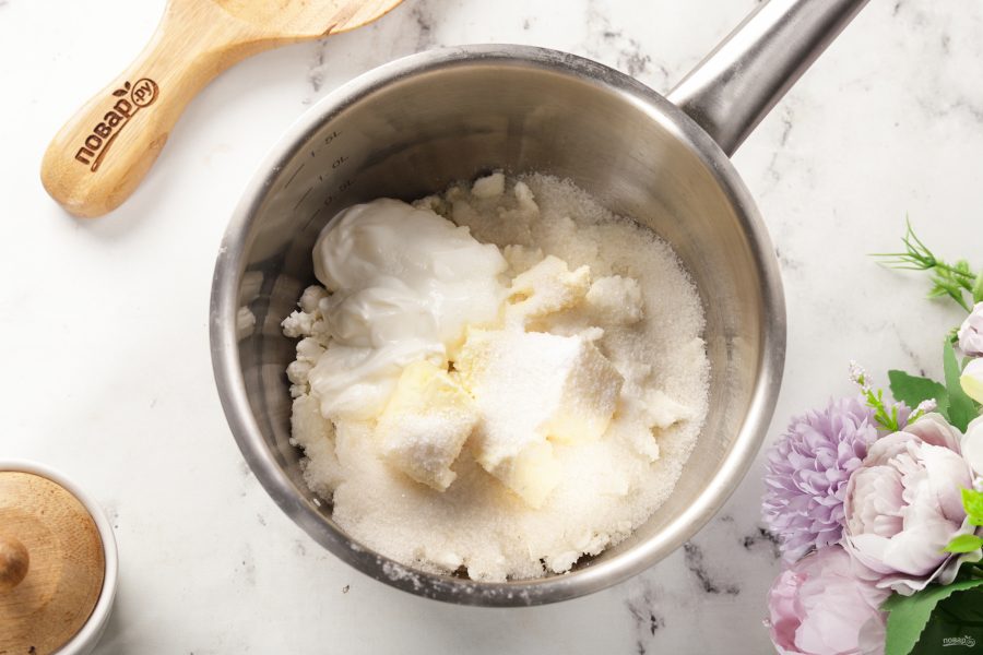 Добавьте мягкое сливочное масло, сметану, сахар и ванилин.