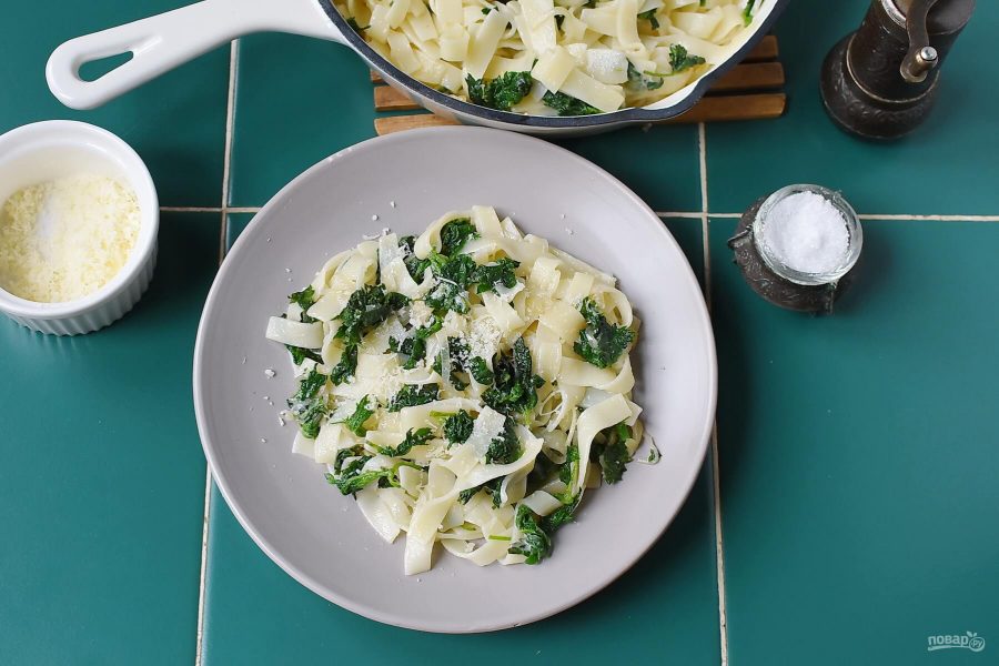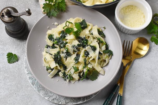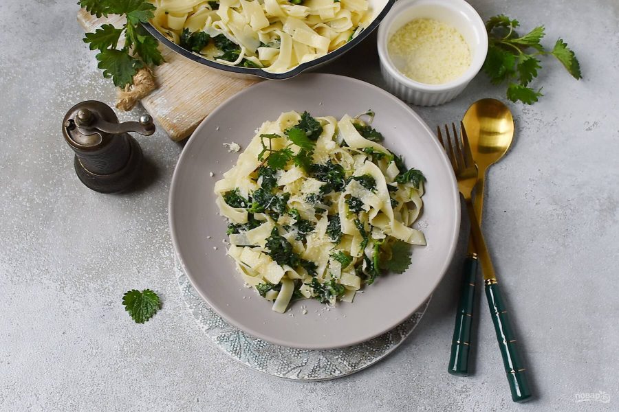 Выкладывайте пасту с крапивой в подогретые тарелки и посыпайте остатками пармезана.