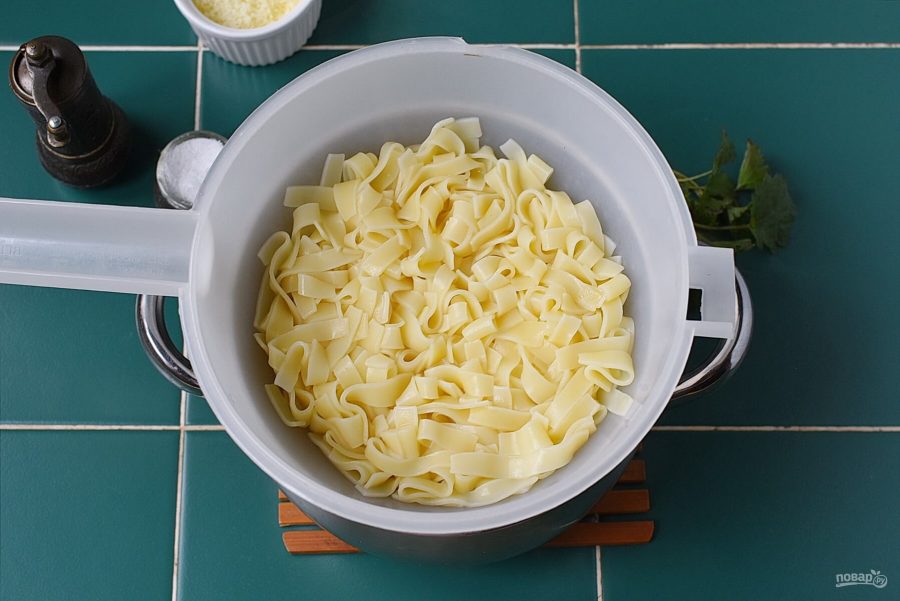 Одновременно приготовьте пасту в хорошо подсоленной воде. Откиньте на дуршлаг, сохранив примерно стакан воды, в которой варилась паста.