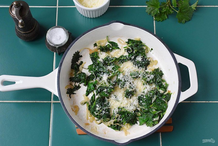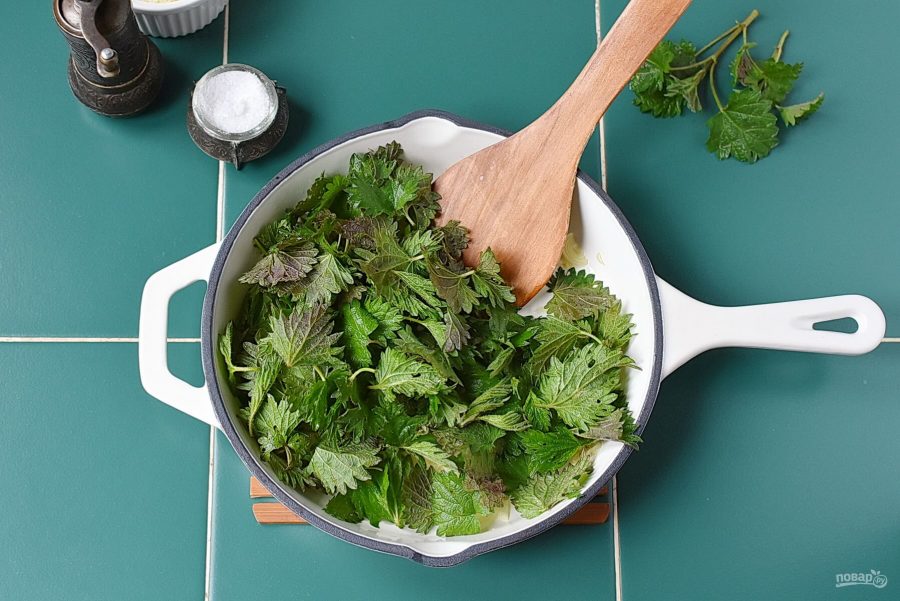 Добавьте крапиву и помешивая, дайте ей увять на сковороде.