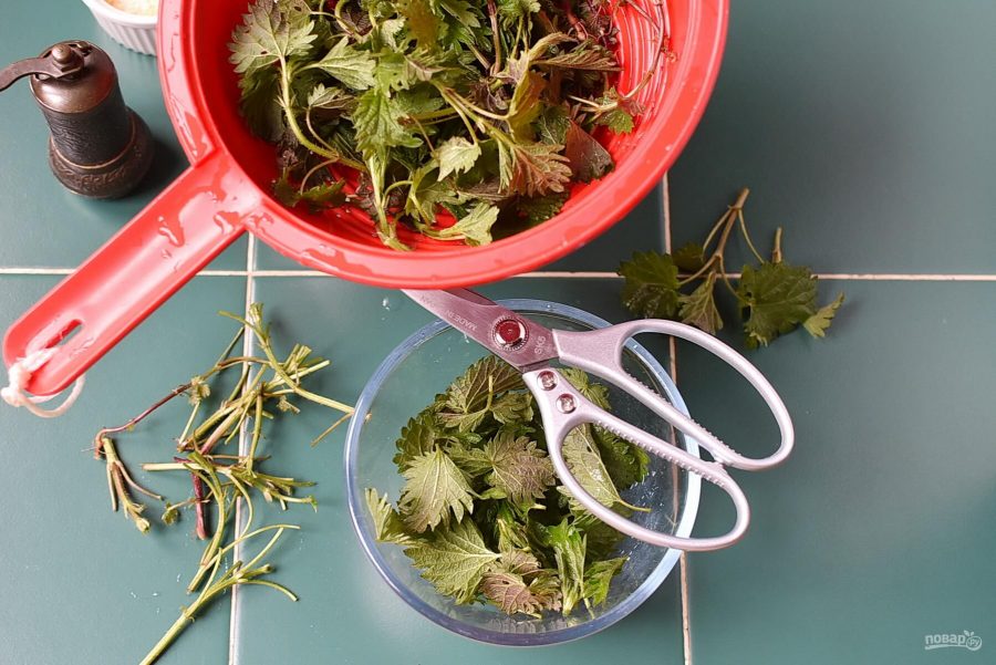 Крапиву следует подготовить. Хорошо промойте и откиньте на дуршлаг. Работая в перчатках, обрежьте только листочки крапивы. Стебли выбросьте. Если крапива молодая и листочки мелкие, готовьте такую крапиву целиком. Если листья покрупнее, нарежьте крапиву на части.