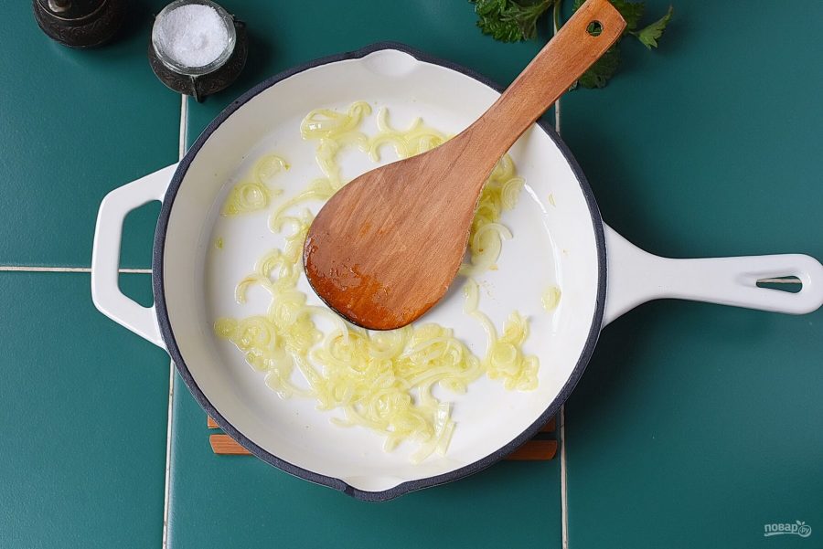Разогрейте в сковороде топленое масло и выложите мелко нарезанный лук шалот. Прогрейте лук до прозрачности, не давая ему румяниться.