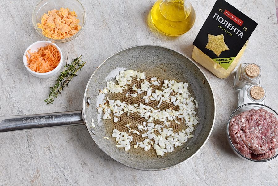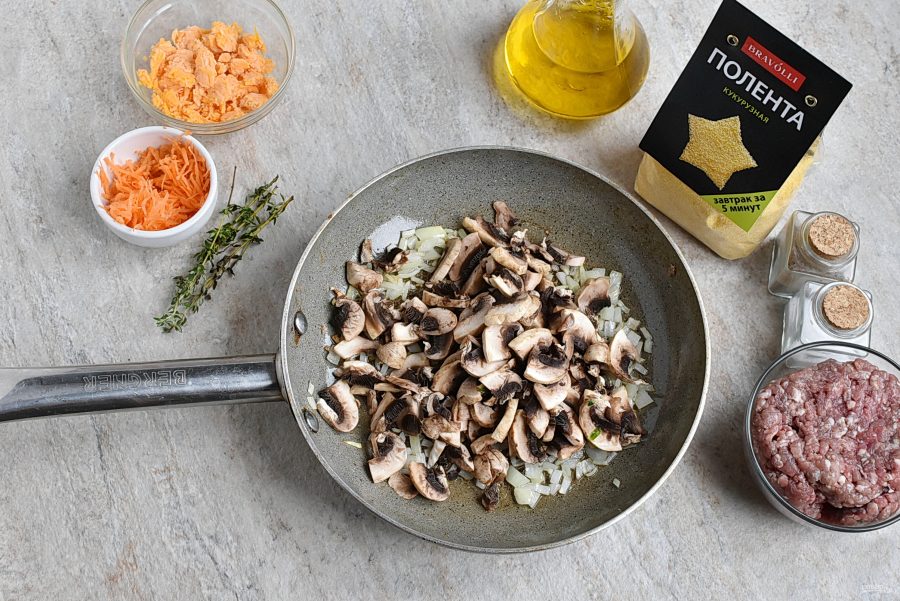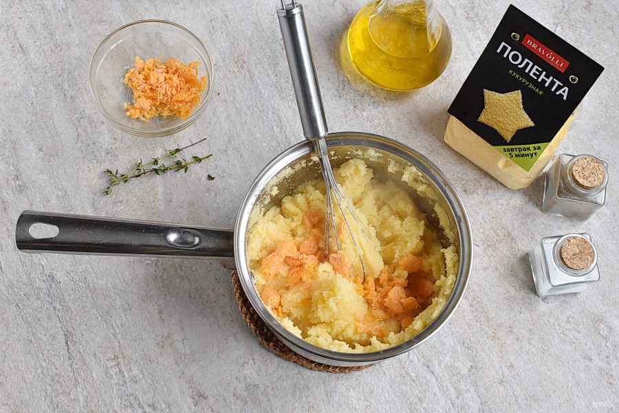 Параллельно приготовьте поленту "Bravolli», следуя инструкции на упаковке. Это быстро и просто. Воды возьмите 2,5 стакана и подсолите по вкусу.