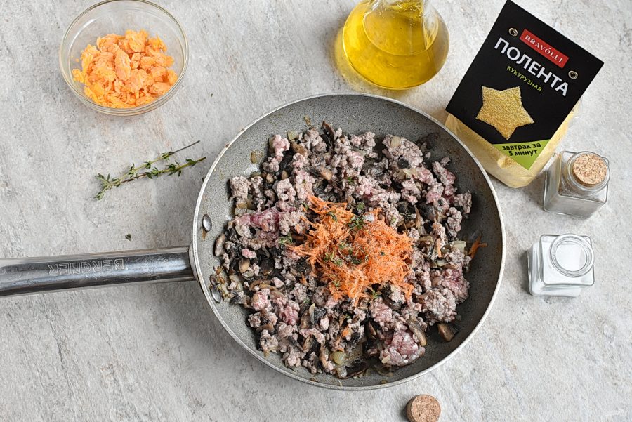 Добавьте тертую морковь, посолите и поперчите по вкусу, добавьте листочки свежего тимьяна. Перемешайте и готовьте еще пару минут.