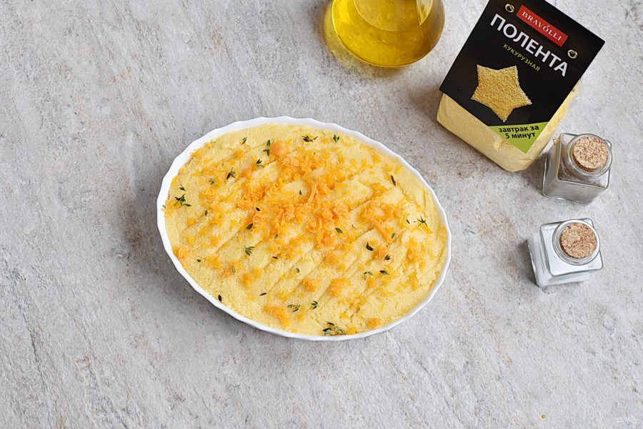 Сверху ровным слоем выложите поленту «Bravolli», разровняйте верх и посыпьте остатками тертого сыра.