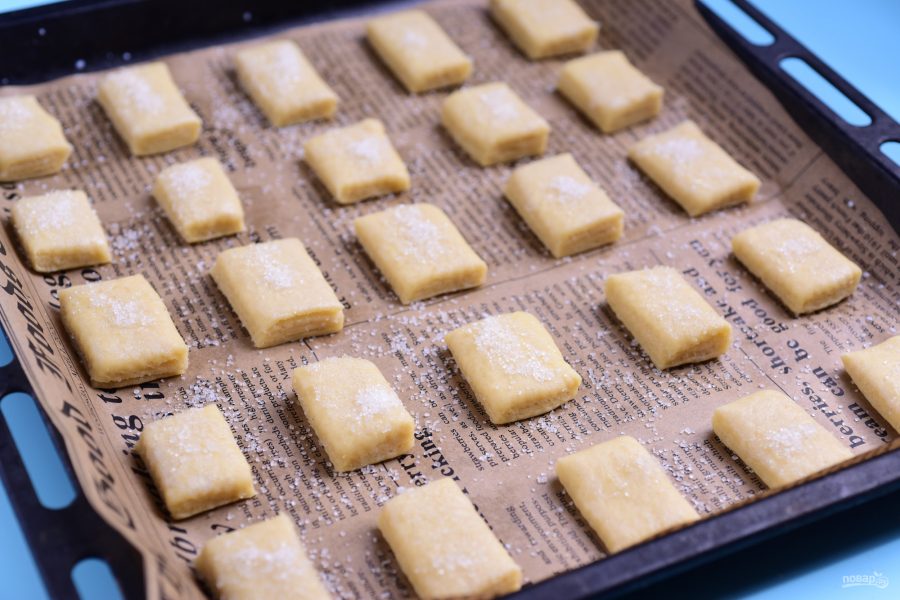 Противень застелите пергаментом для выпекания и выложите все заготовки Павловского печенья. Поверхность каждой заготовки печенья смажьте молоком с помощью силиконовой кисточки и присыпьте сахаром. Выпекайте печенье в заранее разогретой до 180 градусов духовке в течение 15 минут.