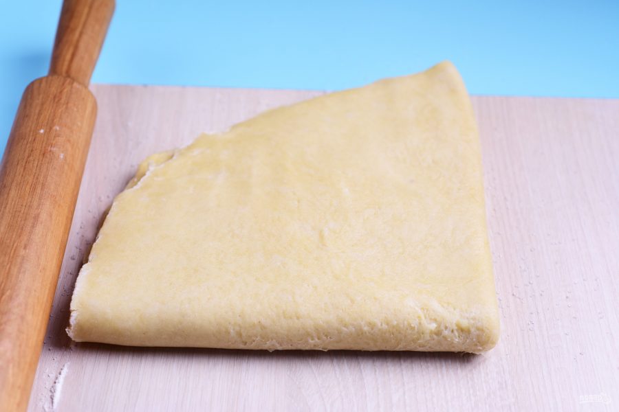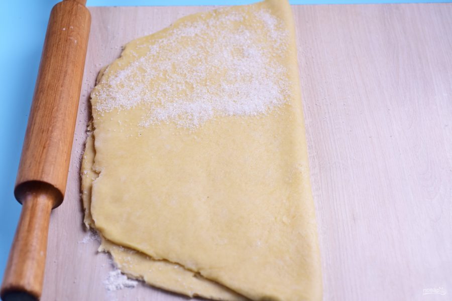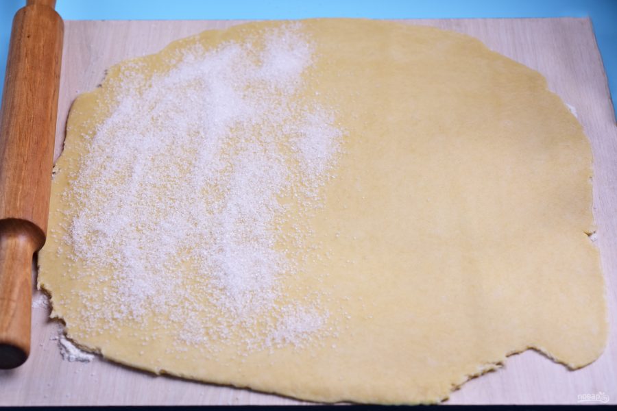 Затем тесто выложите на рабочую поверхность, предварительно немного подпыленную небольшим количеством муки. Раскатайте тесто скалкой в пласт толщиной примерно в 0,3 мм. На одну часть раскатанного теста высыпьте часть сахара.