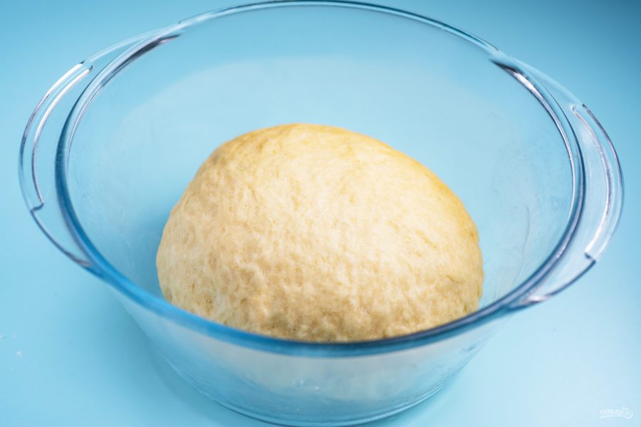 Замесите мягкое тесто, не прилипающее к рукам. Тесто округлите в миске, миску накройте кухонным полотенцем и позвольте постоять в покое в течение часа. За это время тесто поднимется и увеличится в объеме примерно в два раза.