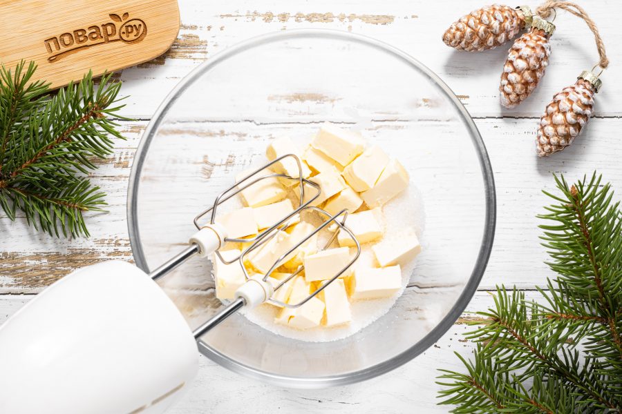 В глубокой миске взбейте сливочное масло с сахаром и щепоткой ванилина до пышности с помощью миксера.