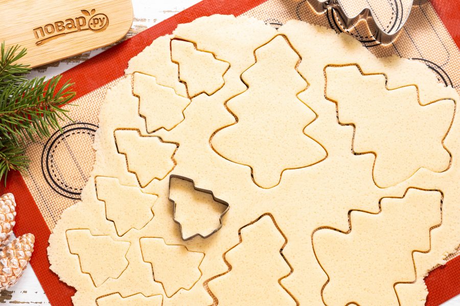 Вырежьте из теста с помощью формы для печенья елочки.