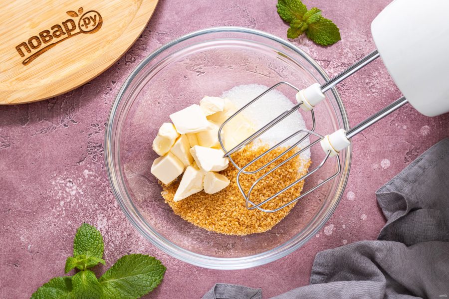 В глубокую миску выложите мягкое сливочное масло. Добавьте белый и коричневый сахар в миску. Взбейте все вместе миксером до пышности и однородности.
