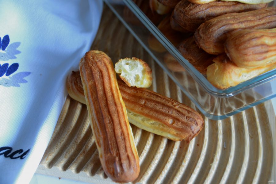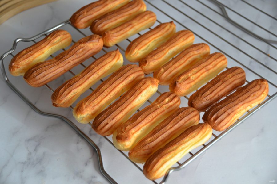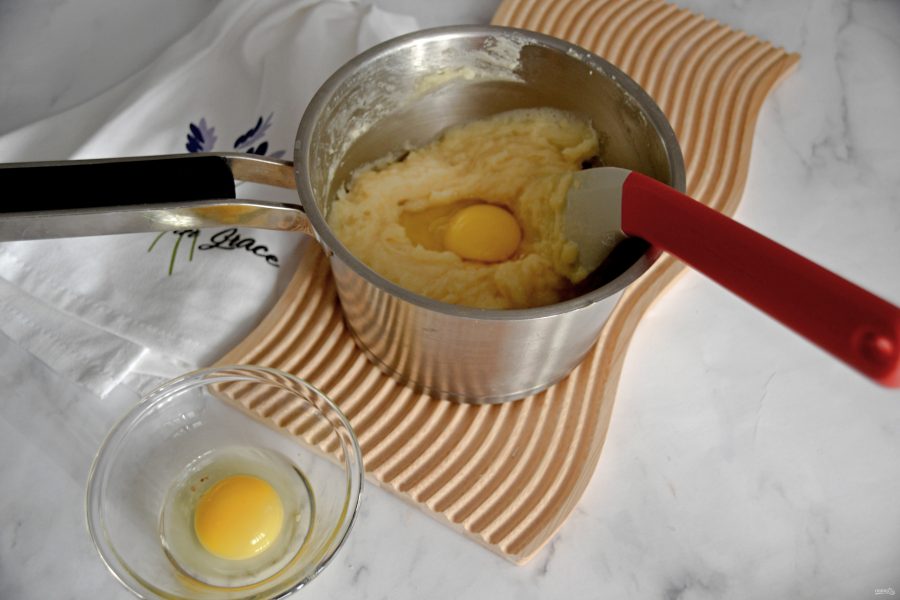 Тесто должно собраться в ком и отставать от стенок сотейника, подсушите тесто еще около минуты при постоянном помешивании, снимите с огня, остудите в течение 5-10 минут, перед тем, как вводить яйца.