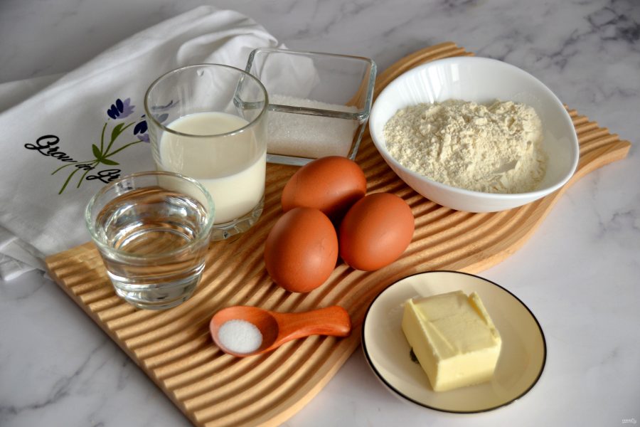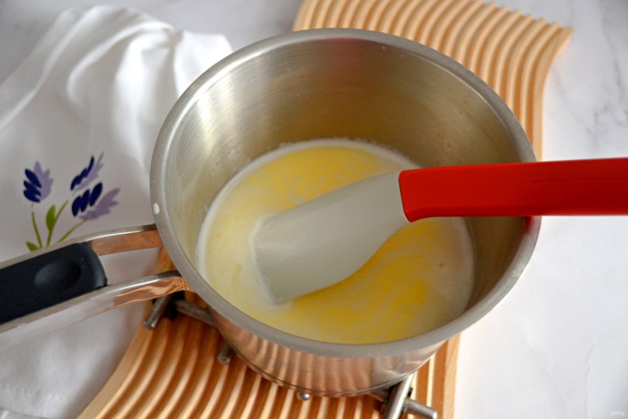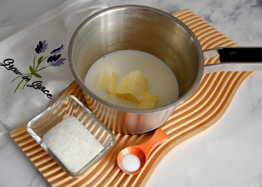 В сотейник или в ковш с толстым дном влейте воду и молоко, всыпьте сахар и соль, добавьте сливочное масло.