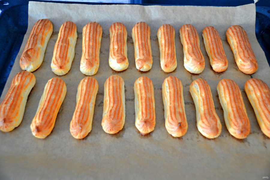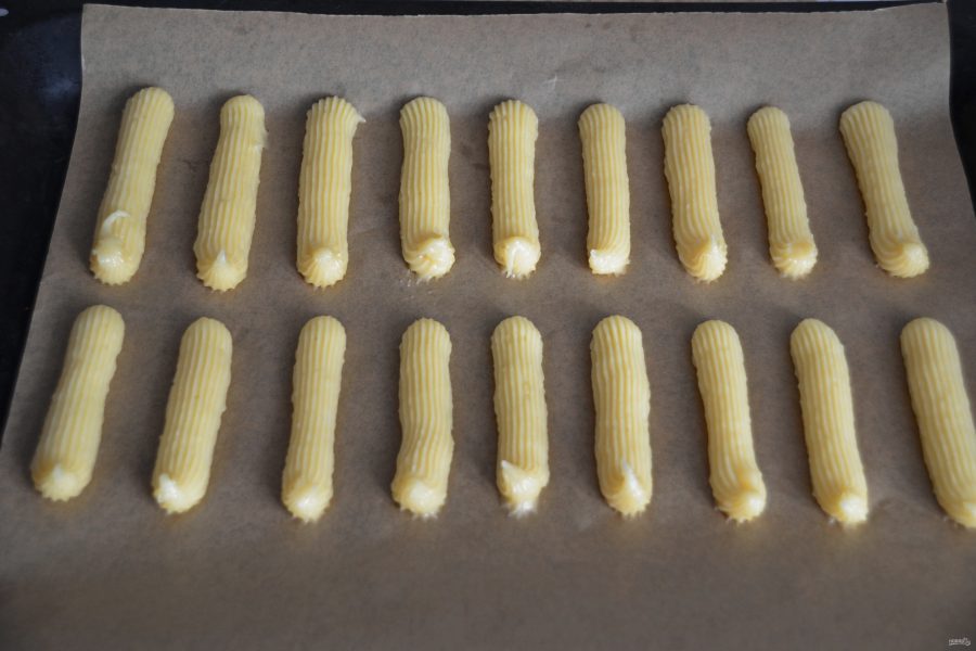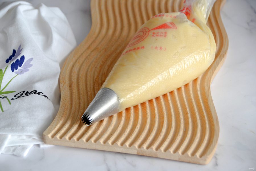Переложите тесто в кулинарный мешок с насадкой. Если нет такого мешка, «заварики» можно отсаживать с помощью чайной ложки, или просто переложить в пакетик с отрезанным уголком. На вкус форма печенья никак не влияет.