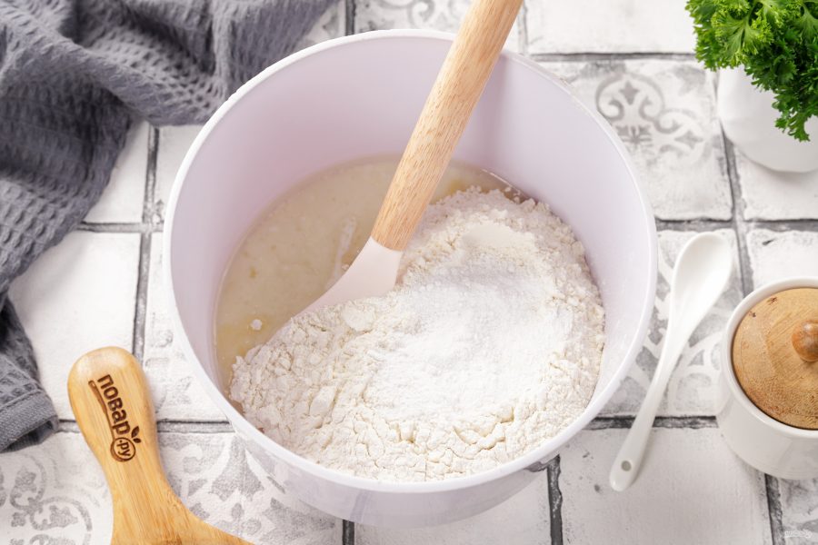 Я сначала добавляю 300 грамм муки, а затем частями подсыпаю оставшуюся, т.к. муки может уйти чуть больше или меньше.