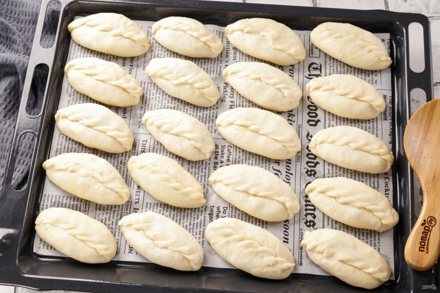 Перенесите пирожки на противень, застеленный специальным ковриком или, как у меня, силиконизированным пергаментом. Можно просто смазать противень растительным маслом.
