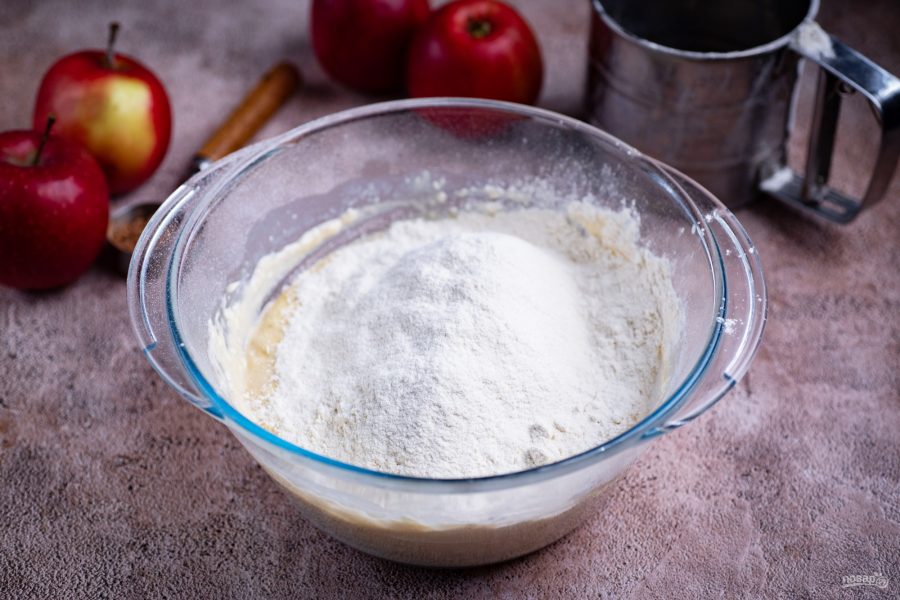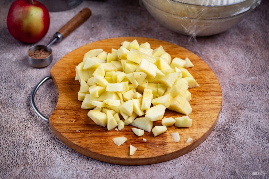Приготовьте яблочную начинку для пирожков. С яблок снимите кожуру и мякоть нарежьте