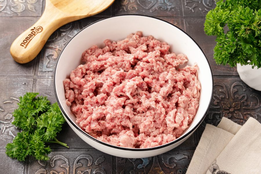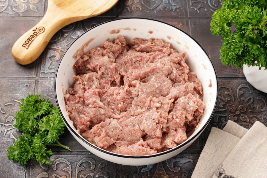 Перемешайте до однородного состояния. Если фарш сильно густой, то влейте немного ледяной воды для сочности.