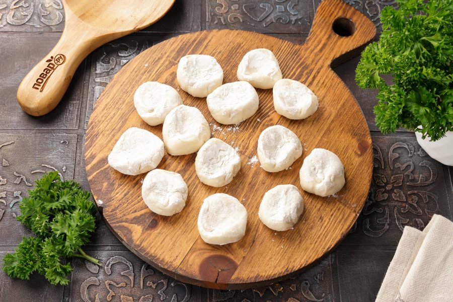 Раскатайте в круг до толщины 2-3 мм. Выложите на тесто начинку. Плотно защипните края и сформируйте пельмени любой формы на ваш вкус.