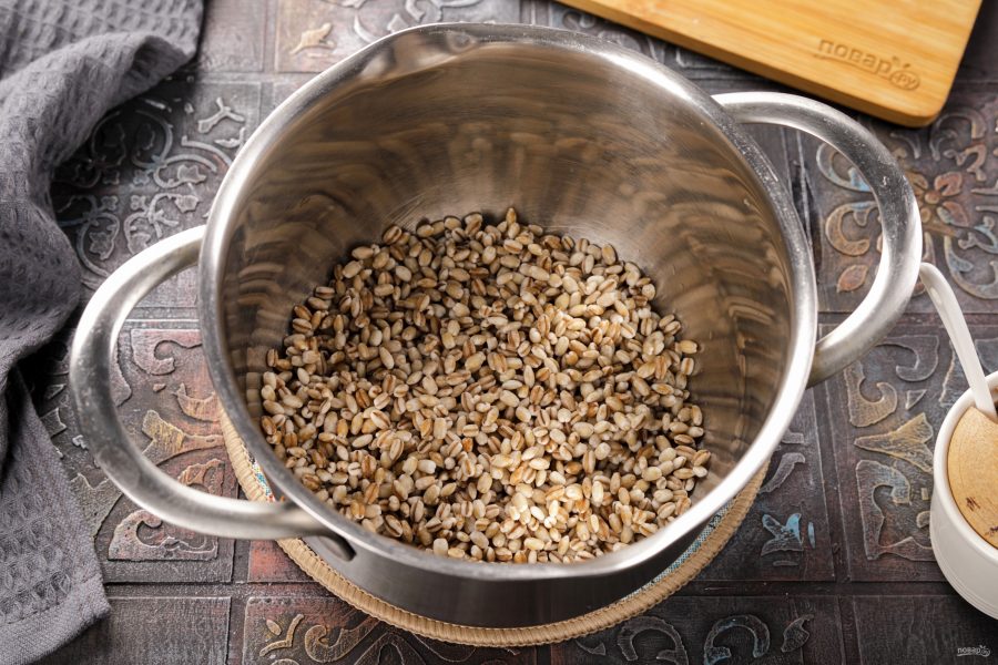 Для того чтобы каша получилось нежной и хорошо разварилась, необходимо предварительно замочить перловку. Промойте крупу, залейте холодной водой и оставьте на ночь.