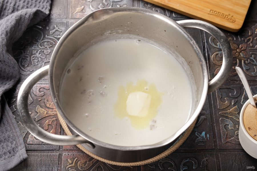 Залейте перловку молоком, доведите кипения и убавьте огонь до минимума. Накройте кашу крышкой и варите на медленном огне 30-40 минут.