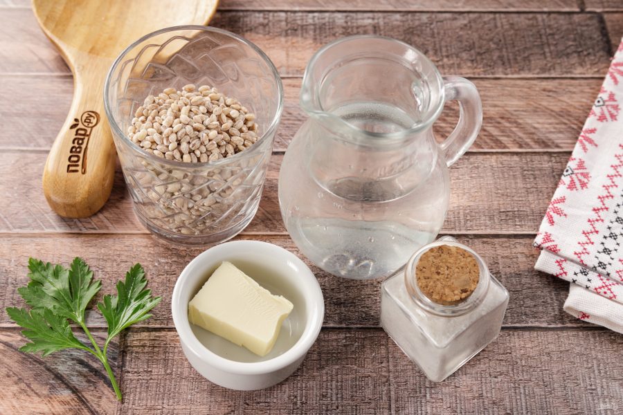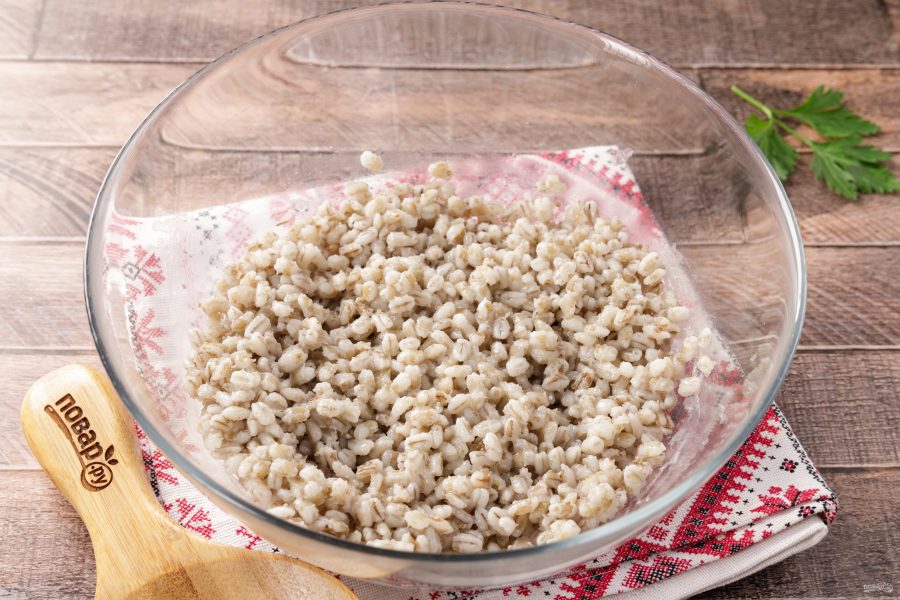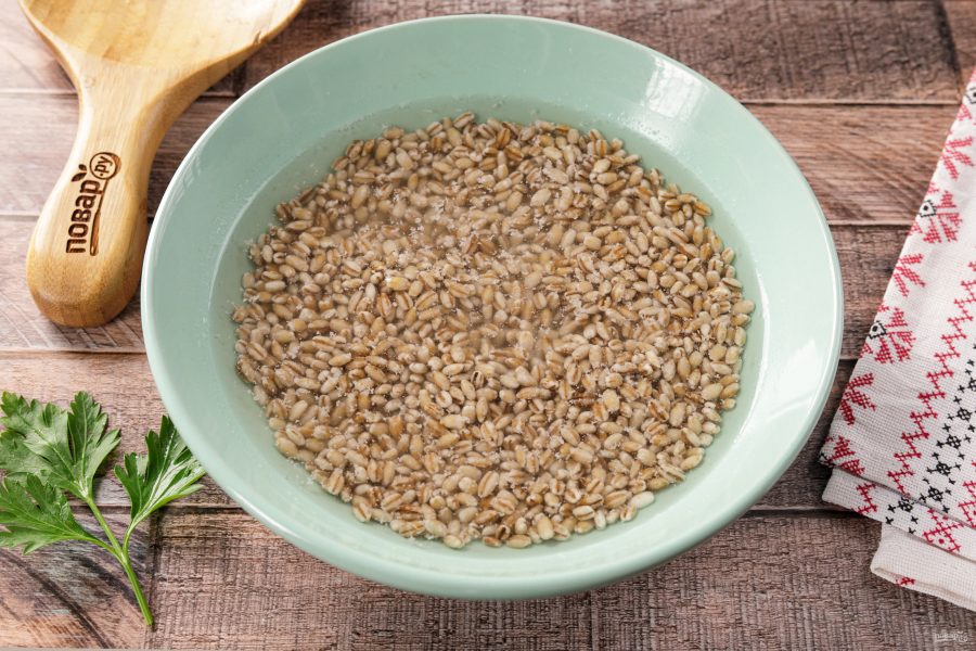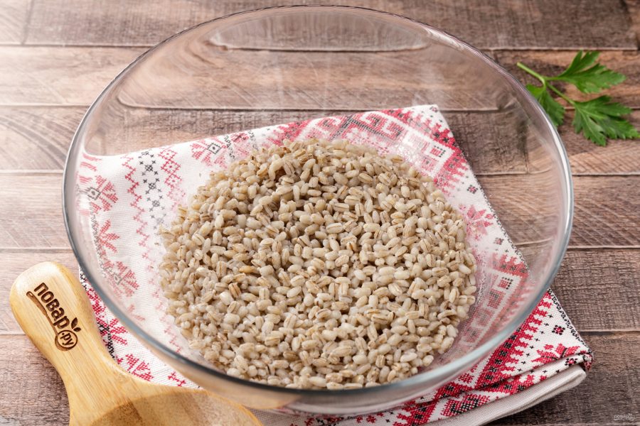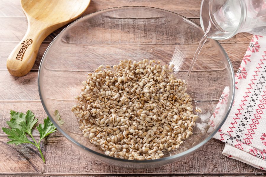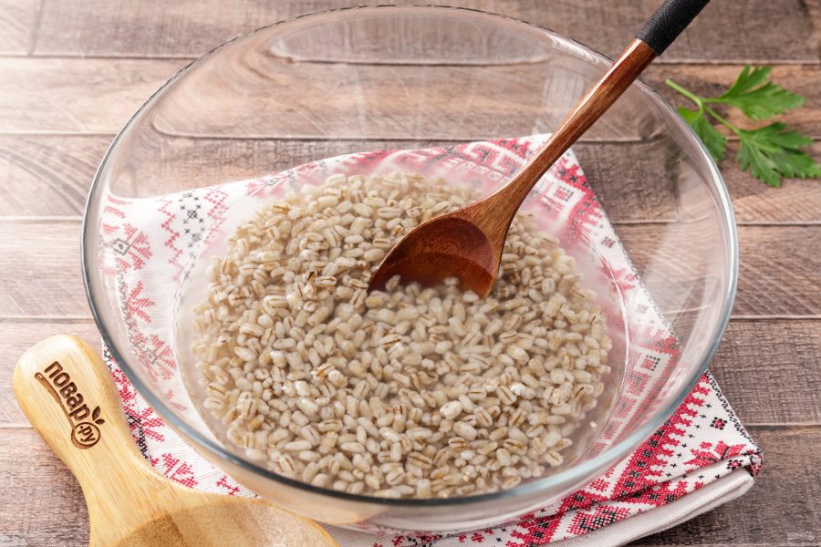Перловку промойте водой и залейте, чтобы она разбухла.