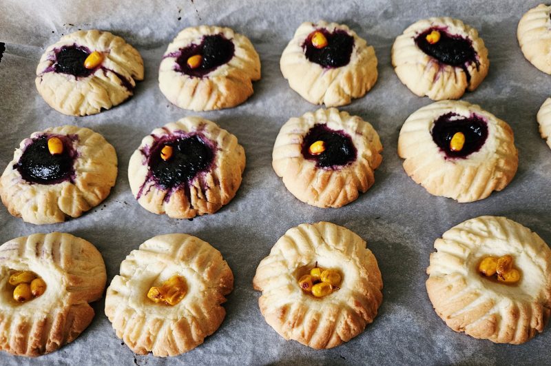 Приготовила я сегодня так для разнообразия.Ягодка облепиха, а конфитюр- и черника и крыжовник. Печенье очень вкусное.