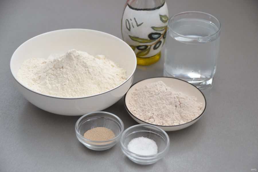 Приготовлением теста займитесь за сутки до приготовления пинсы. Для этого подготовьте соответствующие ингредиенты: муку, ледяную воду, дрожжи соль, оливковое масло.
