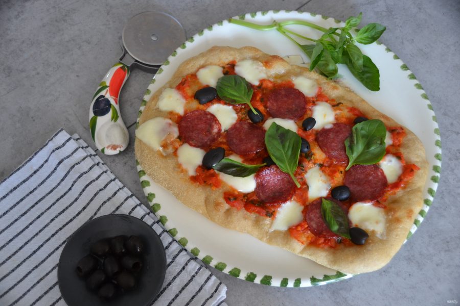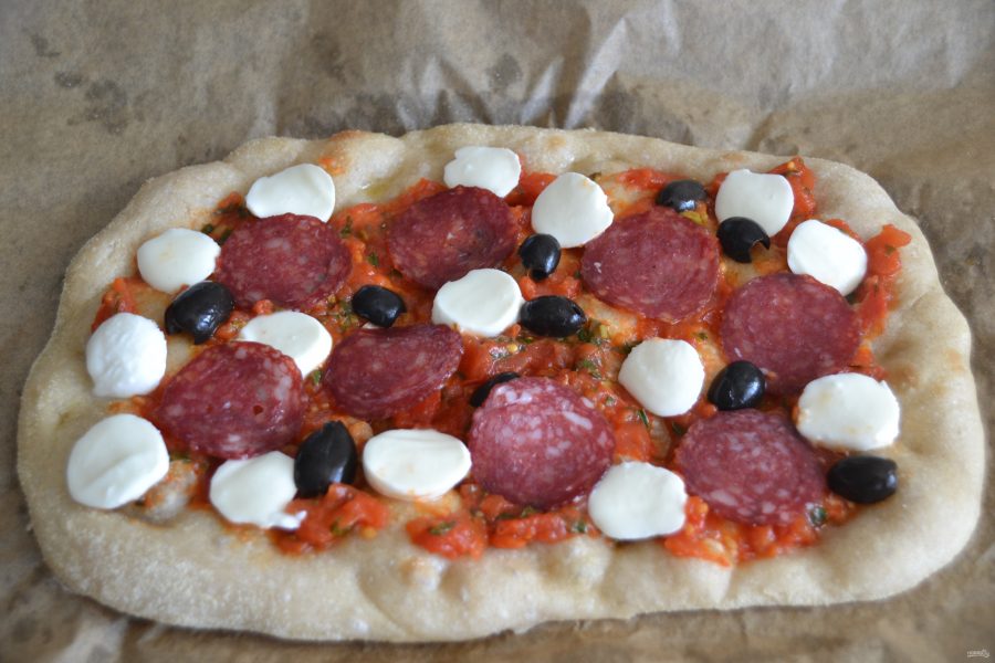 На горячую лепешку выложить томатный соус, моцареллу, маслины или оливки, ломтики салями. Запекать еще примерно 5 минут.