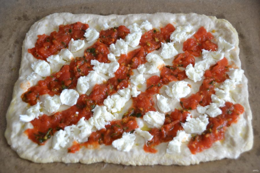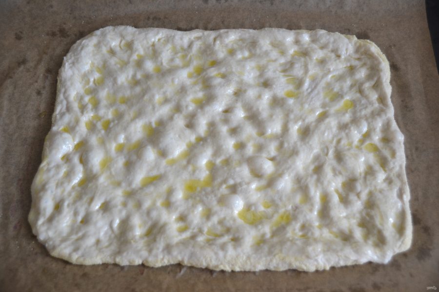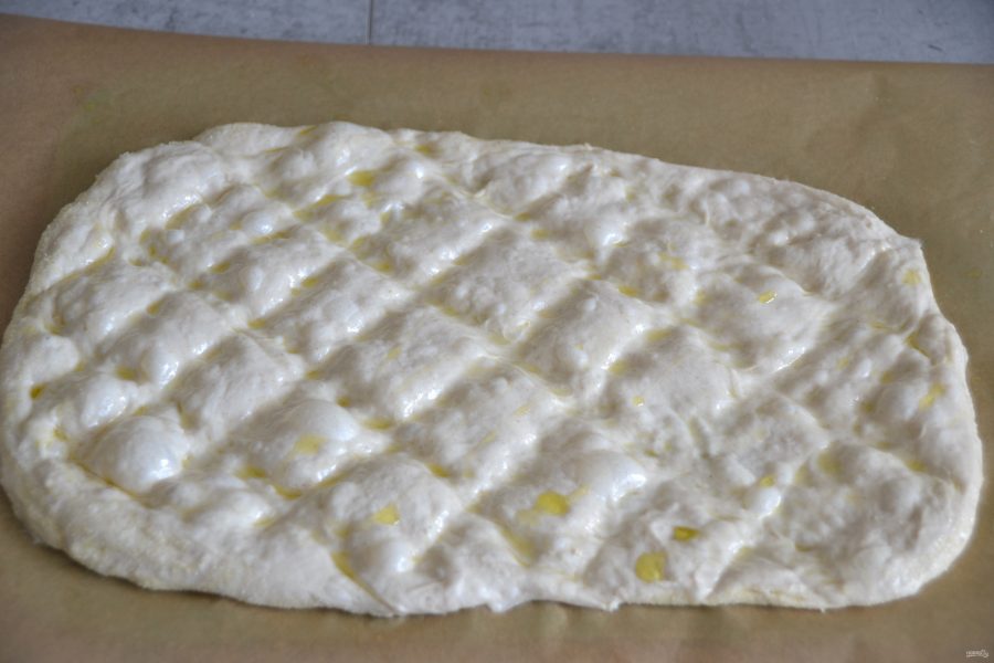Пинсу можно выпекать разными способами. Первый способ, это растянуть тесто в прямоугольный пласт, стараясь сохранить пузырьки внутри теста. Сбрызнуть оливковым маслом, пальчиками сделать в тесте вмятинки.