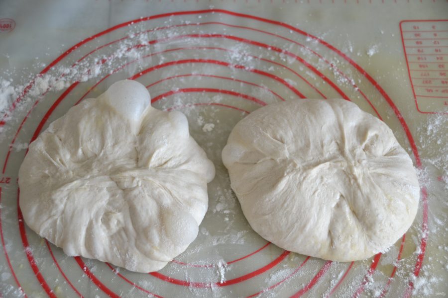 Разделите тесто на 2 части, подкатайте в шар. Можно видеть какие большие пузырьки воздуха образуются в тесте.