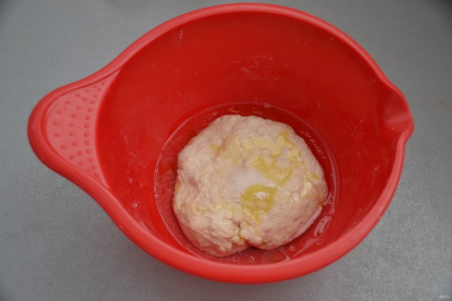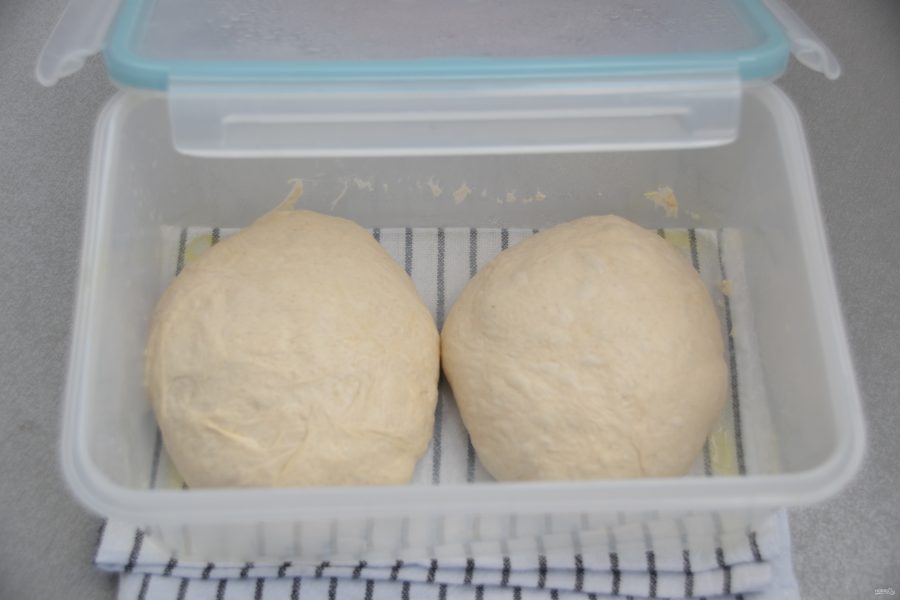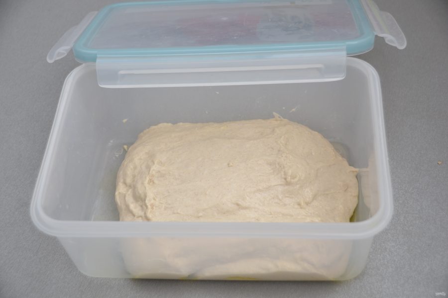 Смажьте контейнер оливковым маслом, переложите тесто в контейнер и уберите в холодильник на 24 часа. За это время тесто должно удвоиться в объеме.