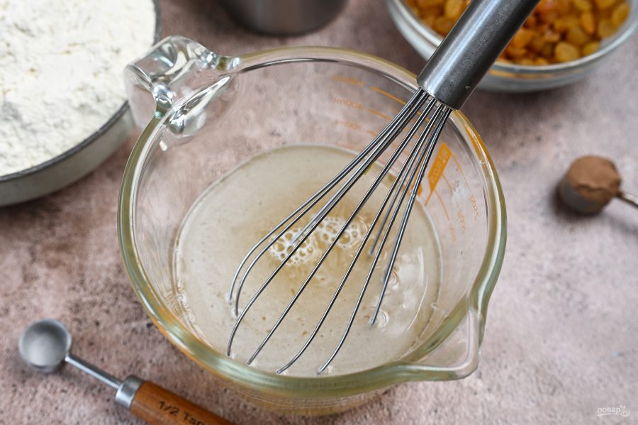 Добавьте изюм и вмешайте его в тесто.