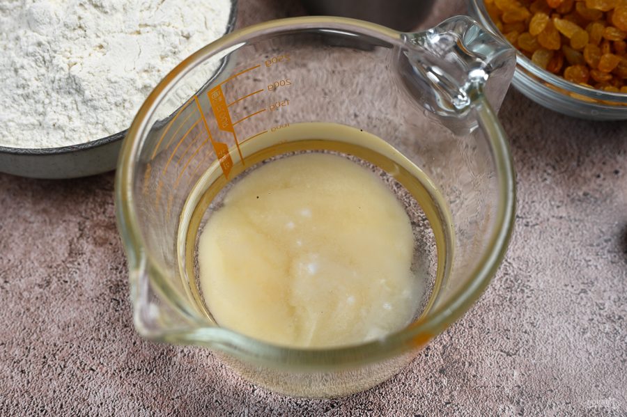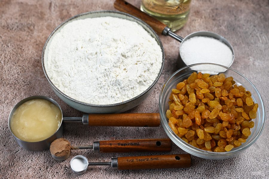 Все ингредиенты выложите на стол перед началом приготовления. Заранее просейте муку. Промойте и высушите на бумажном полотенце изюм.