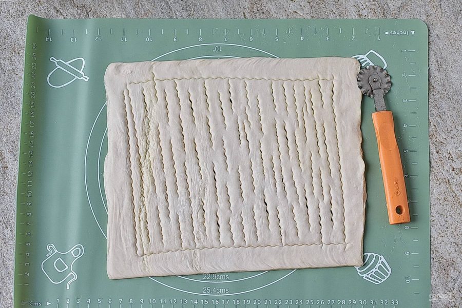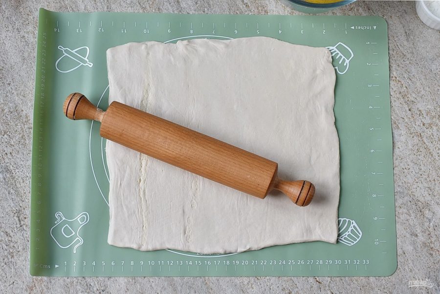 Слоеное тесто разморозьте и слегка раскатайте в одном направлении. Обычно в упаковке два листа. Если у вас тесто в рулоне, разделите его пополам.
