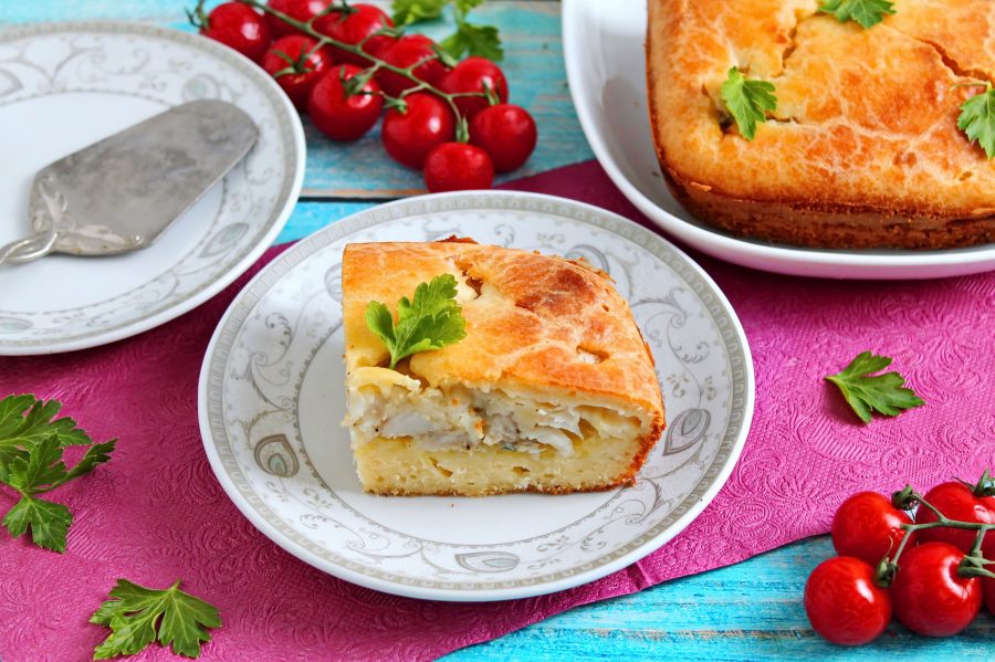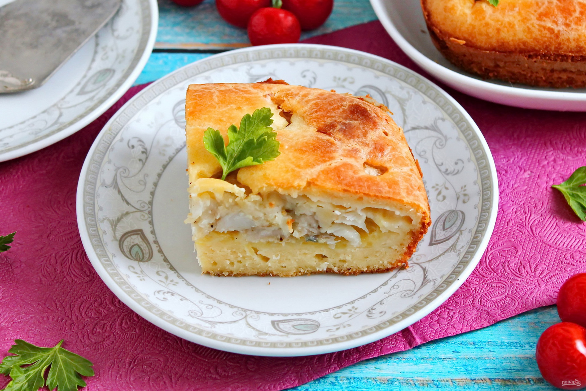 Пирог с палтусом готов. Порежьте его на порции и подавайте на стол.