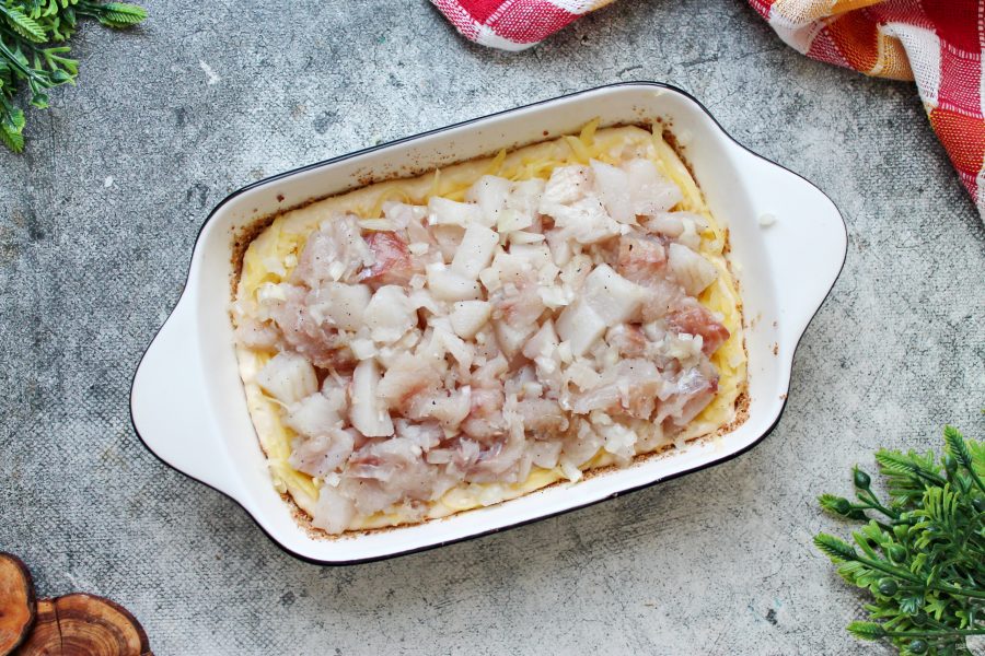 На картофель разложите начинку из палтуса с луком.