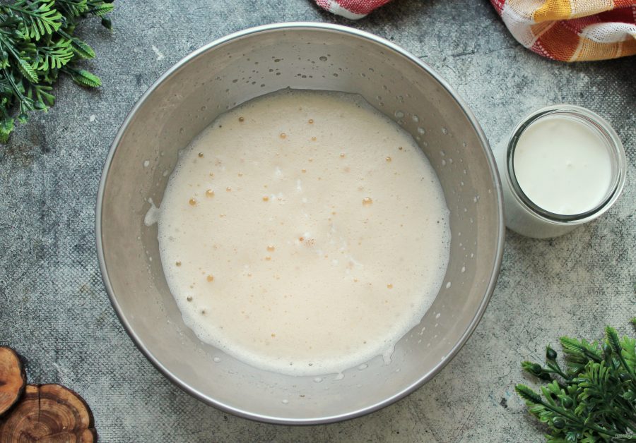 Влейте в яичную массу теплый кефир и аккуратно перемешайте, чтобы не потерять воздушность.