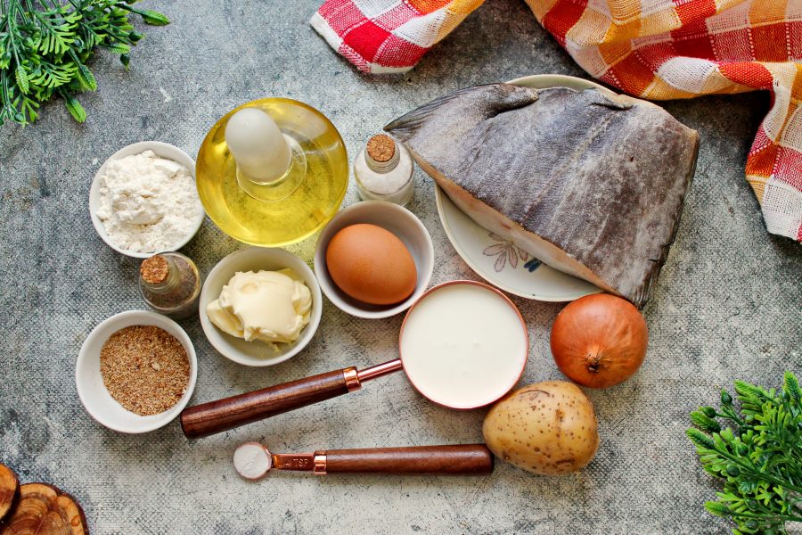 Подготовьте все необходимые ингредиенты для приготовления пирога с палтусом. Палтус почистите от чешуи, вымойте и обсушите бумажным полотенцем. Картофель почистите и вымойте.