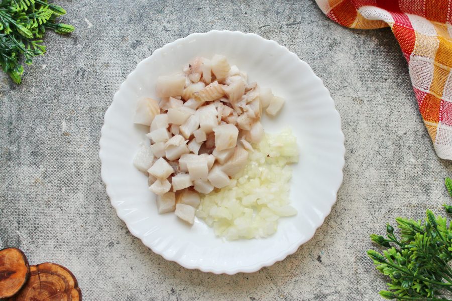 У филе палтуса снимите кожу и порежьте средним кубиком. Репчатый лук почистите, сполосните и мелко порежьте. Все выложите в миску, посолите, поперчите и перемешайте. При желании можно добавить немного лимонного сока.