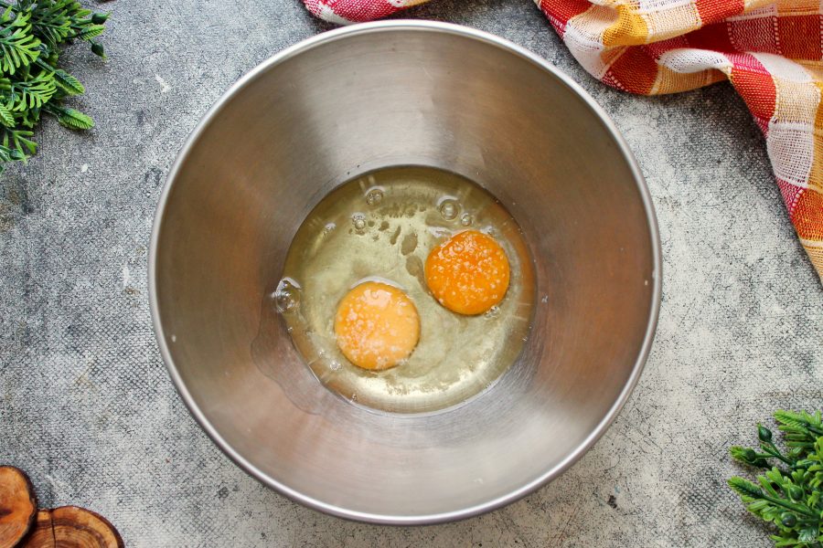 В миску вбейте яйца, посолите и взбейте в пышную, мягкую пену. Масса должна стать светлой и увеличиться.