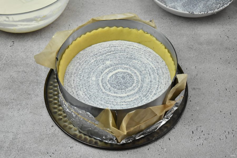 В центр формы выложите порцию (2-3 ст. ложки) белой творожной начинки. В центр белой творожной начинки выложите порцию творожной массы с маком. Таким образом, чередуя белую творожную массу с маковой, наполните форму, используя весь объем подготовленной начинки.